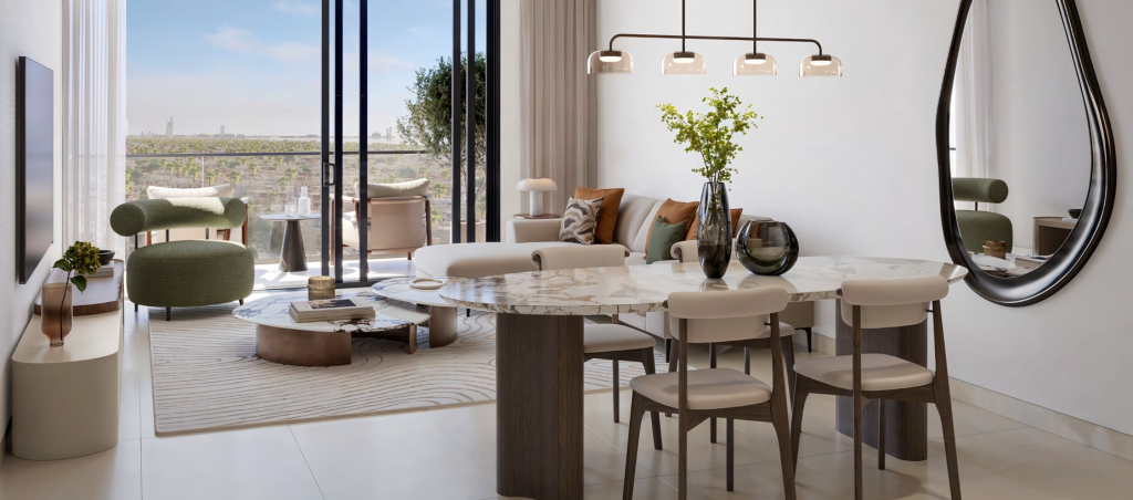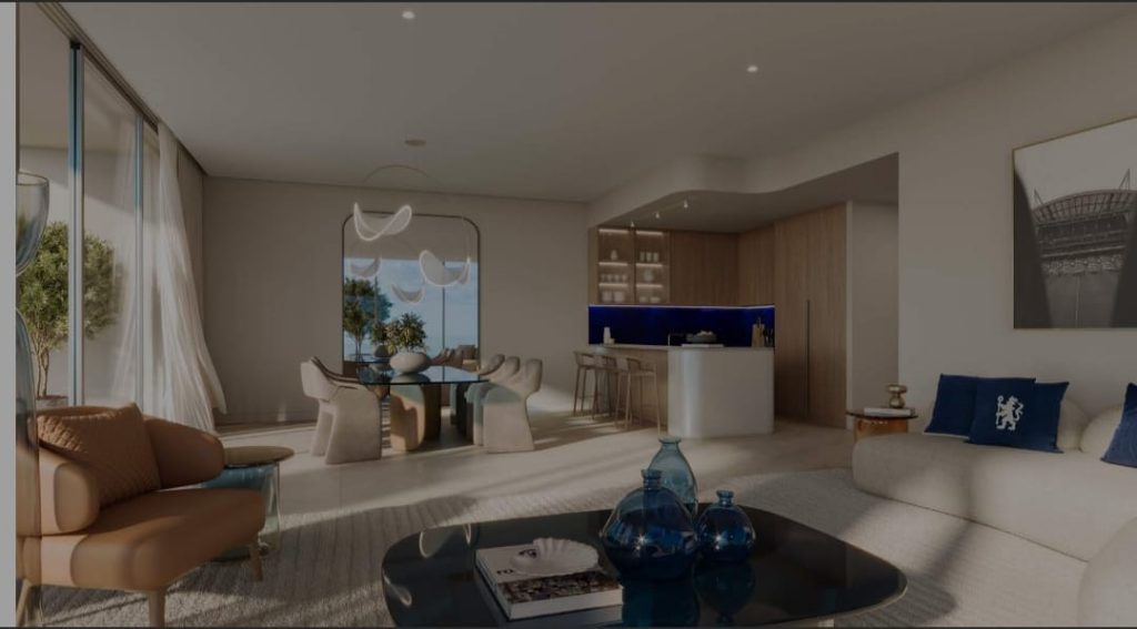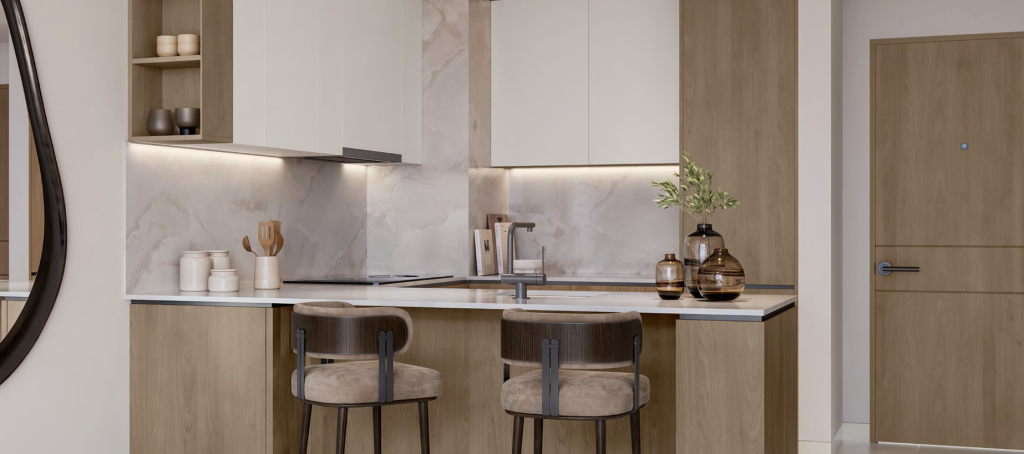 The two-bedroom residences are designed to balance private retreat and shared living. Spacious living and dining areas flow into a modern, fully equipped kitchen, complete with sophisticated finishes and integrated appliances. The living room features premium materials and clean architectural detailing that set a polished tone throughout.